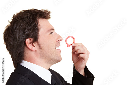 Hand mit Lupe sucht in Portraits als Umfrage und Marktforschung Konzept