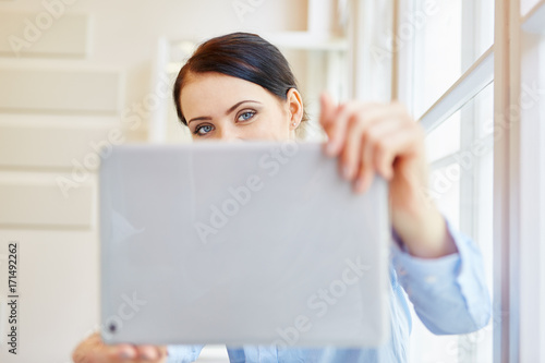 Junge lächelnde Geschäftsfrau hält leeres Schild