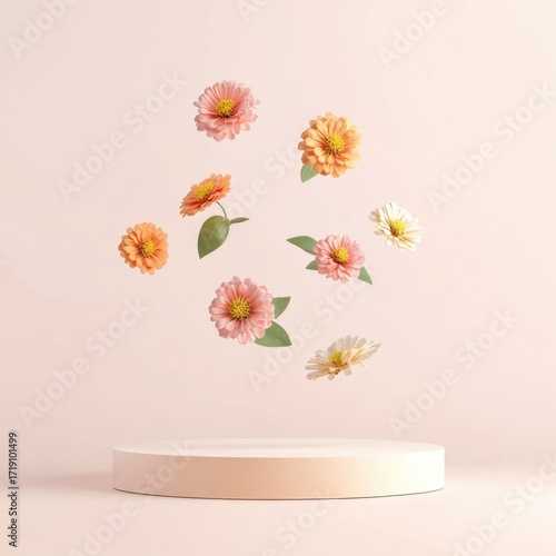 3D floating zinnia flowers with a minimalist podium on pastel background