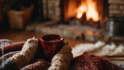 Cozy winter scene with hot chocolate and marshmallows by fireplace