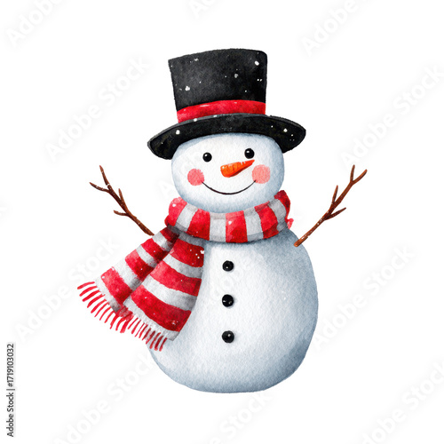 PNG watercolor snowman with black top hat and red scarf, cheerful winter character for holiday scenes