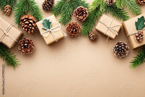Festive Christmas gift boxes and pine cones arranged with evergreen branches and twine