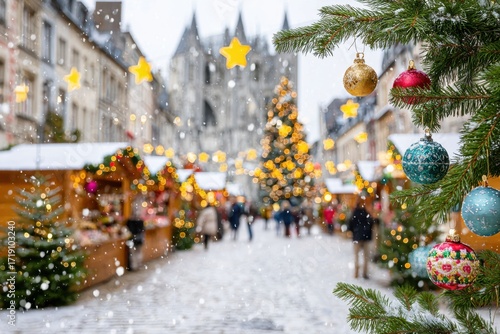 Bustling Christmas market street with festive decorations