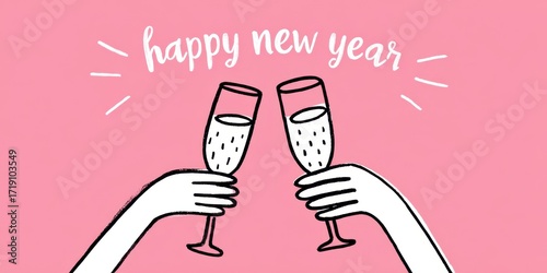 Two hands clink champagne glasses in a festive New Year celebration toast