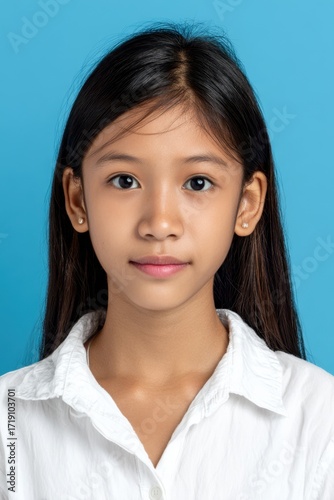 Passport ID portrait of a young Asian Vietnamese girl against a blue background