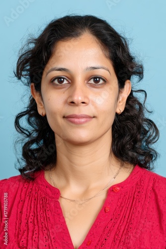 Professional photo ID portrait of a young Indian woman with a neutral expression