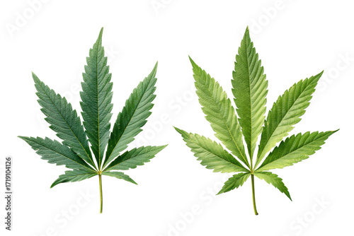 Cannabis leaf isolated on white background, detailed close-up of marijuana leaf