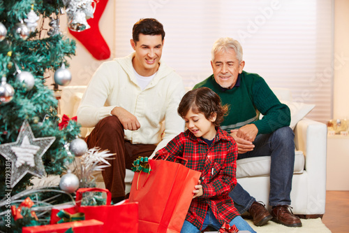 Kind mit Vater und Großvater zu Weihnachten