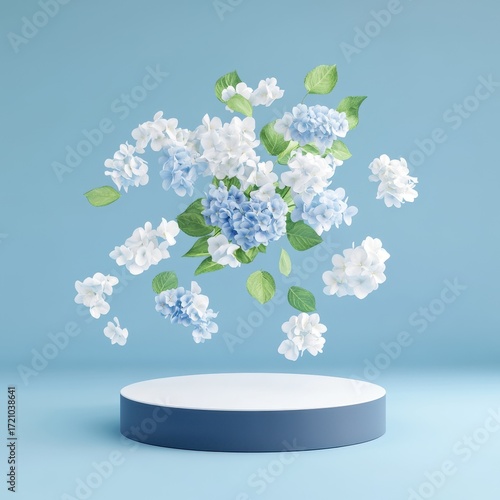 Elegant 3D rendering with hydrangeas floating over a navy blue podium