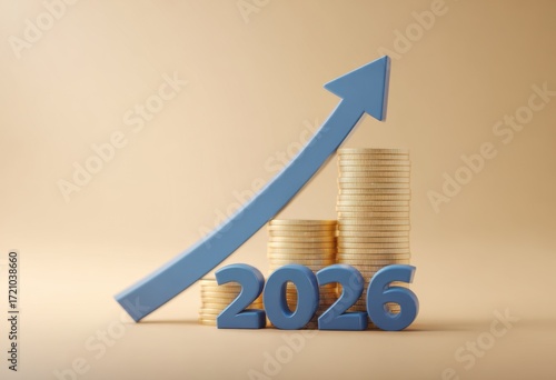 Golden 2026 year and coins with an upward arrow symbolizing economic growth