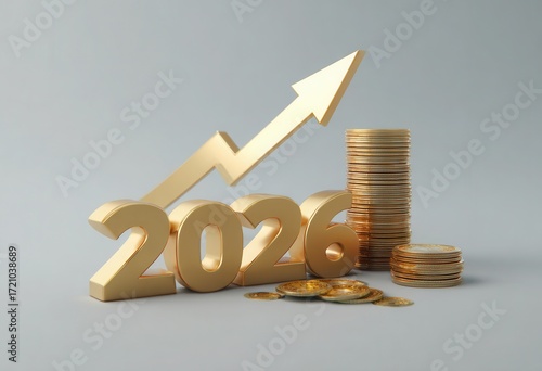 Golden 2026 year and coins with an upward arrow symbolizing economic growth