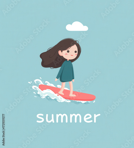 Flat illustration of a young girl enjoying surfing on a clear summer day