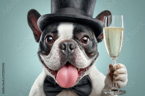 French bulldog in a top hat and bow tie holding a champagne glass for celebration