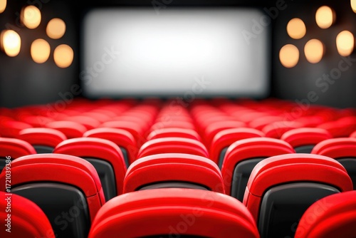Empty movie theater with red seats and a bright blank screen, creating a calm cinema atmosphere