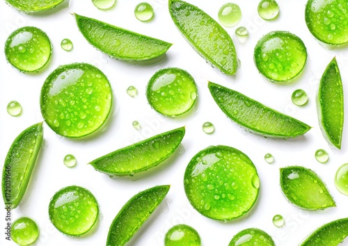 Fresh aloe vera gel slices and leaves on a bright white background with water droplets