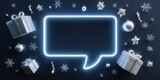 Glowing neon speech bubble surrounded by holiday gifts and decorations