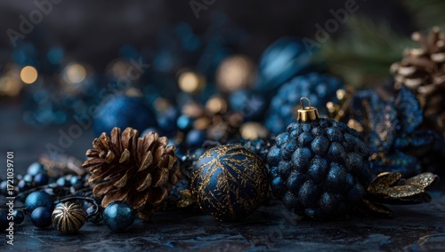 Blue and gold Christmas ornaments with pinecones on dark festive background