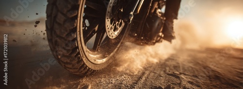 Motorcycle wheel kicking up desert dust during sunset ride