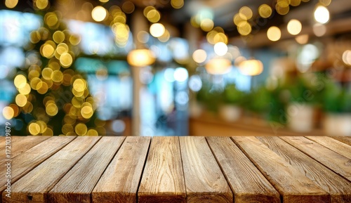 Wooden table in a cozy cafe with warm bokeh lights and festive blurred background