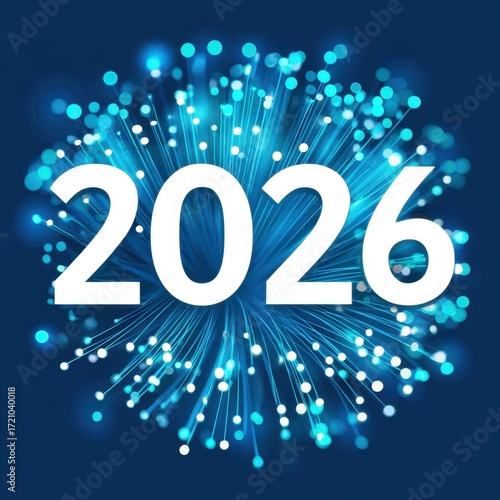 Celebratory 2026 design with bright blue fireworks and radiant fiber light bursts