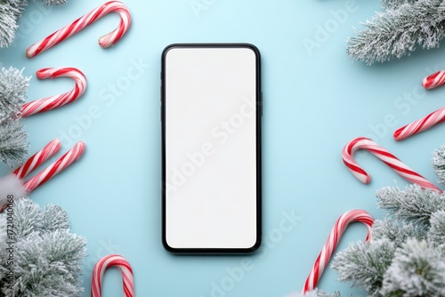 Smartphone surrounded by candy canes on a frosty Christmas background