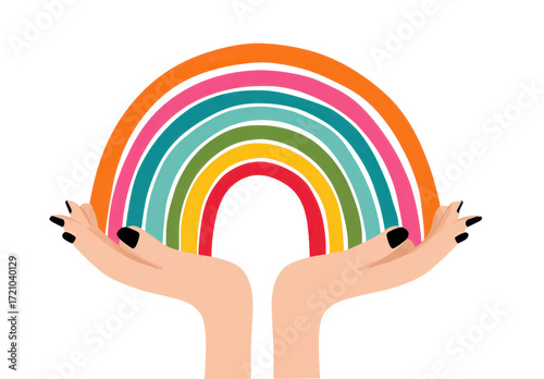PNG supportive hands cradle a colorful rainbow, symbolizing hope, unity, and creativity in a bright illustration