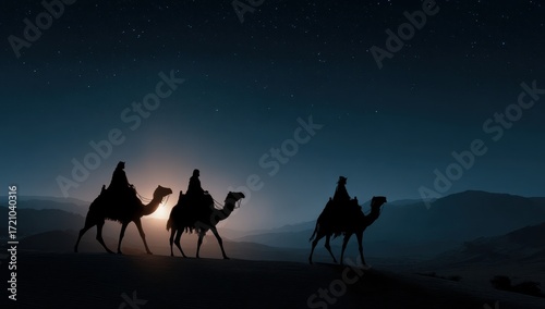 Three Wise Men on Camels Follow the Star to Bethlehem at Night