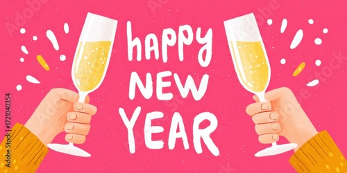 Two hands clink champagne glasses in a festive New Year celebration toast
