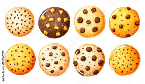 PNG watercolor cookie assortment with chocolate chips and toppings for dessert design