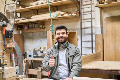 Start-Up Gründer mit Bauzeichnung in Tischlerei