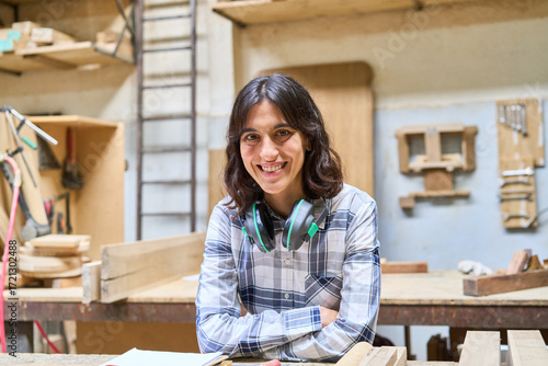 Young woman smiling confidently in a busy woodworking workshop
