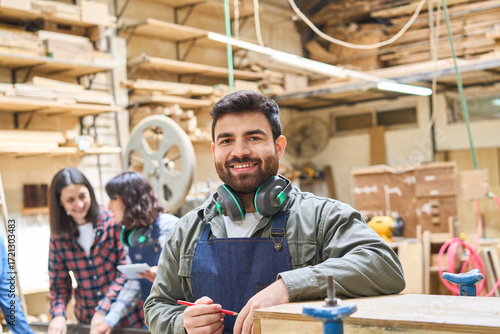 Confident carpenter standing in a busy woodworking shop with tools