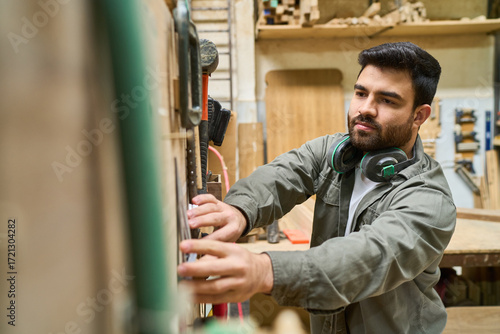 Experienced craftsman teaching young apprentice in a woodworking shop