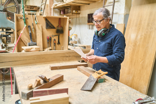 Skilled craftsman inspecting wood in a busy lumberyard workshop