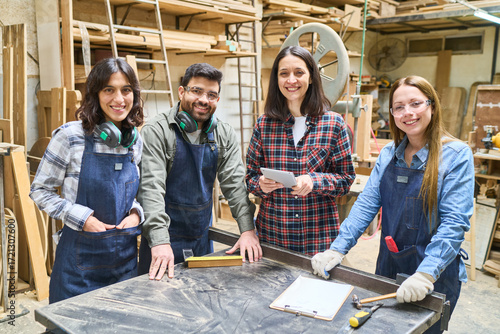 Young apprentices and mentor collaborating in a busy lumberyard workshop