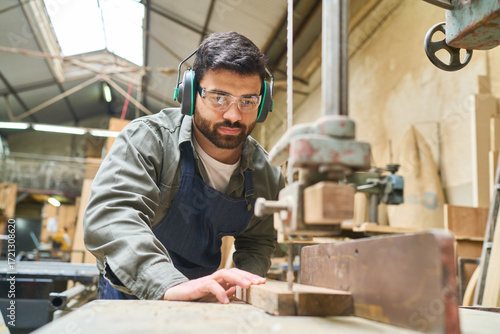 Experienced craftsman teaching young apprentice in a woodworking shop