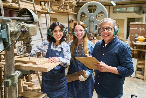 Experienced craftsman teaching young apprentice in a woodworking shop