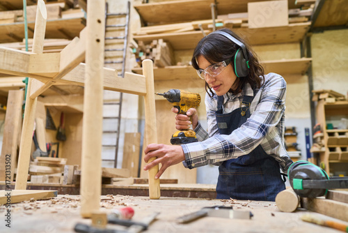Experienced craftsman teaching young apprentice in a woodworking shop
