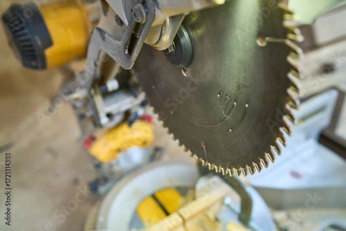 Skilled craftsperson using circular saw in a busy woodworking shop