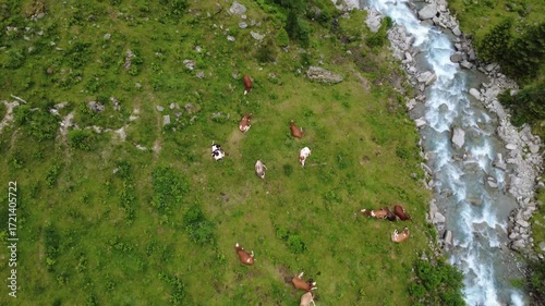 Aerial Drone View of Cows Grazing by a Rushing River in the Austrian Alps