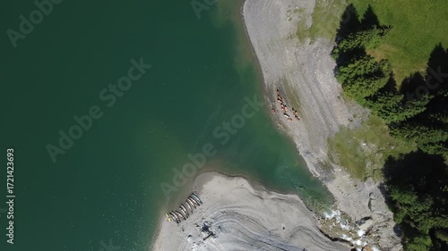 Aerial View of Cows Grazing by a Serene Alpine Lake in the Austrian Alps, Summer.