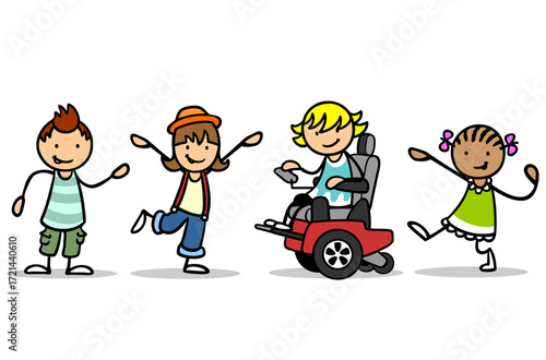 Inklusion Konzept mit Gruppe Cartoon Kinder und Rollstuhl