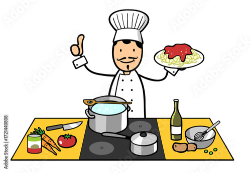 Cartoon Koch an Herd in Küche mit Spaghetti und Tomatensauce