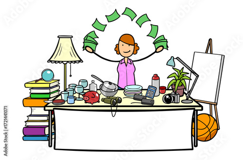 Frau mit Stand beim Flohmarkt als Nebenverdienst zeigt Einnahmen