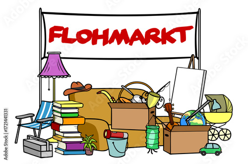 Termin Ankündigung für Flohmarkt auf Banner mit Trödel
