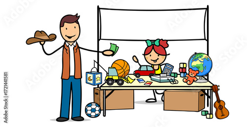 Cartoon Kinder verdienen Geld mit Spielzeug verkaufen auf Flohmarkt
