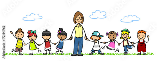 Cartoon Frau mit Gruppe Kinder bei Kita Ausflug