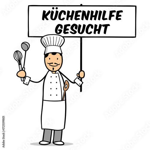 Cartoon Koch Menu hält Küchenhilfe gesucht Schild hoch als Stellenanzeige
