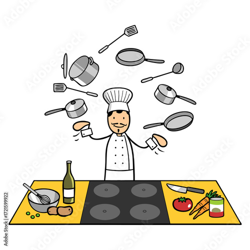 Cartoon Koch an Herd in Restaurant jongliert mit Pfanne