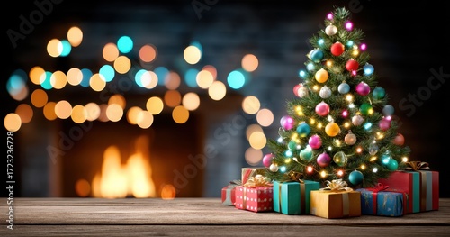 Cozy Christmas scene with a colorful Christmas tree, gifts, and a warm fireplace backdrop